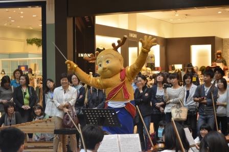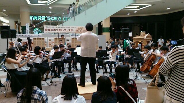 奈良県立ジュニアオーケストラ「奈良の木づかいフェスタ」 投稿日: 10/11/2015 投稿者: 梅沢和人 UMEZAWA Kazuto 10月4日、イオンモール橿原にて弦楽器小編成による演奏、奈良の木で作られた指揮台で指揮しました。 指揮者体験タイムでは飛び入り参加したせんと君に即興で指揮指南、[美しく青きドナウ]で観客の方々に楽しんでいただけたようです。